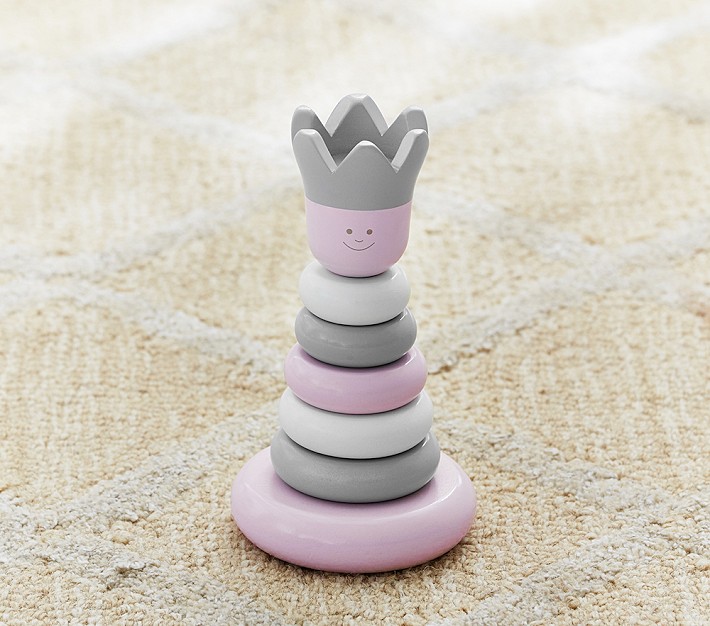 This classic stacker, finished in pink, white and gray paints, will encourage your little one to develop hand-eye coordination skills.