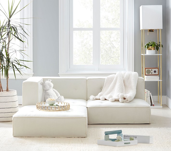 Our modular sectional set takes lounging to the next level. Upholstered sectional pieces have super-comfy tufted cushions, piped edges and a sturdy iron frame for years of reading, snuggles or your little one's solo time.