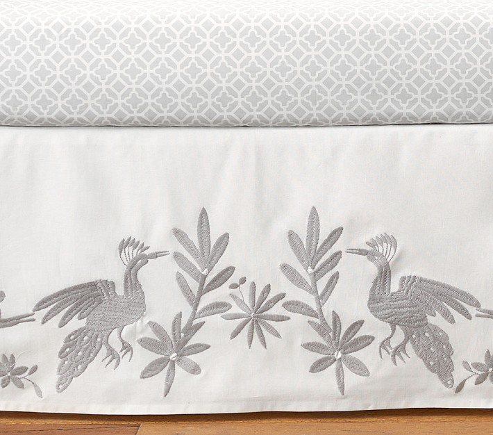 This crib skirt's intricate design is balanced by its muted color palette. Made of pure cotton, it's an elegant accent to your nursery's styling.