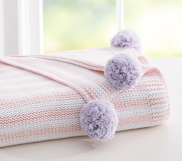 Fuzzy pom-poms adorn the corners of this vibrant striped knit blanket. Made from pure cotton, it’s a playful must-have for your and baby’s outings.
