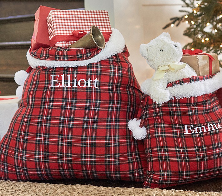 Every family member will love seeing a special bag filled with gifts on Christmas morning. Featuring a red and green tartan pattern and plush faux-fur trim, this classic bag adds magical fun to your holiday.