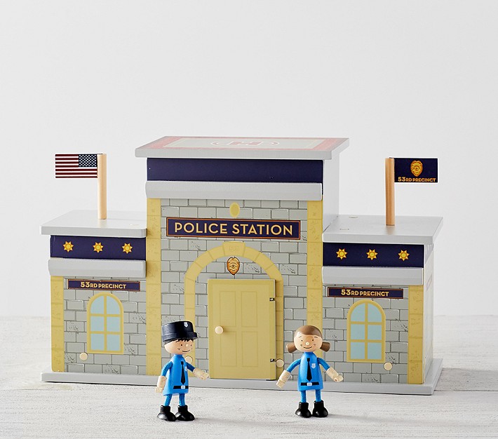 Our police station is ideal for arresting criminals and keeping the streets safe. The solid wood structure includes a jail cell, large windows, a working front door and realistic details like a painted precinct sign and a flag. Wooden criminals are dressed in stripes and officers wear uniforms and badges. (sold separately).