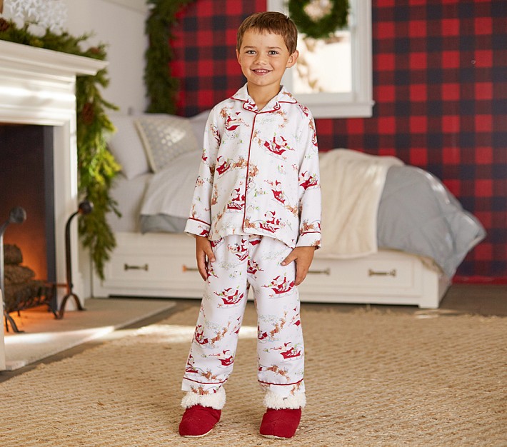 Red piping and classic illustrations of Santa in his reindeer-drawn sled are printed on our soft flannel pajamas to keep kids warm and cozy.