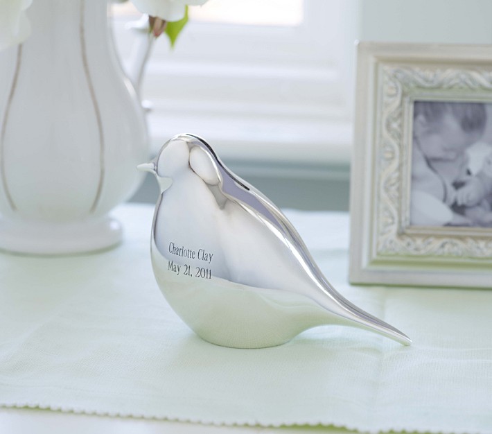 A classic gift of early childhood, our bird-shaped bank is plated in shining silver and can be personalized to create a lasting keepsake.