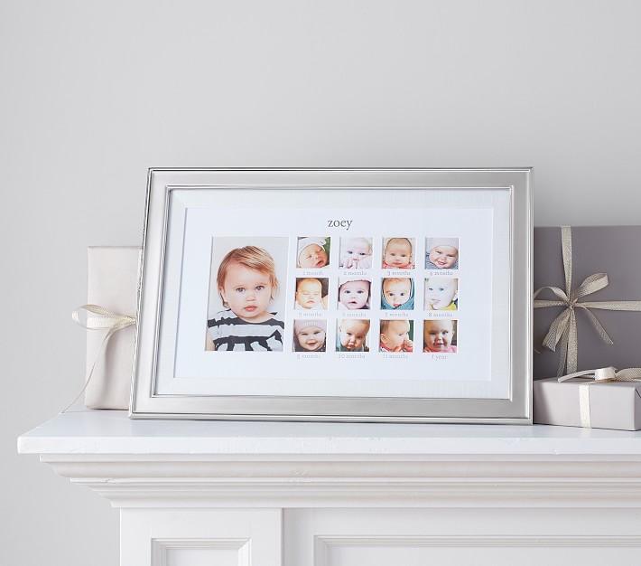 Capture a year of discoveries, growth and milestones with our Silver Grosgrain First Year Frame. With spaces for twelve small photos and one large photo, the off-white mat is elegantly framed in a polished silver plate.