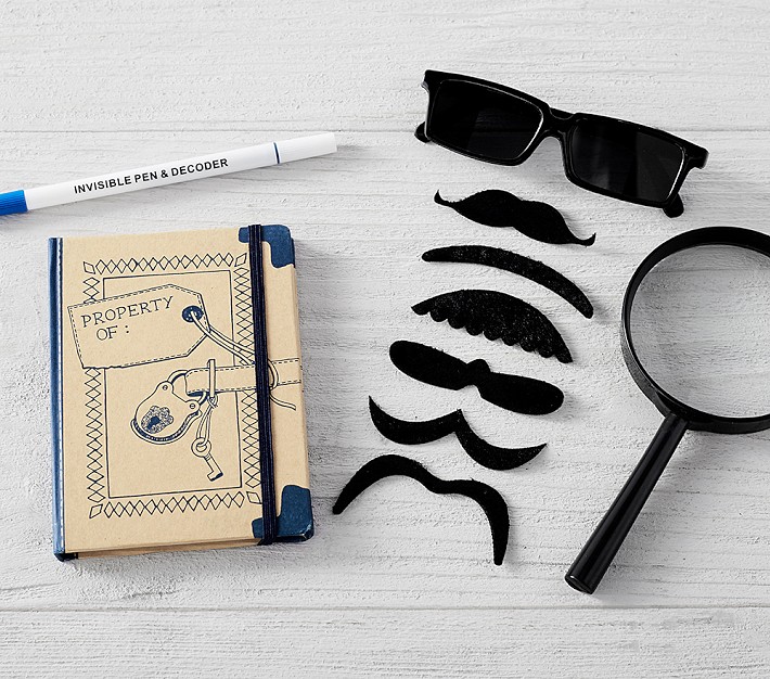 Effective espionage requires the right equipment. Our personalized kit includes field glasses, fingerprint tools, a flashlight, pens for writing and decoding invisible messages, and a printed spy guide for your aspiring agent.