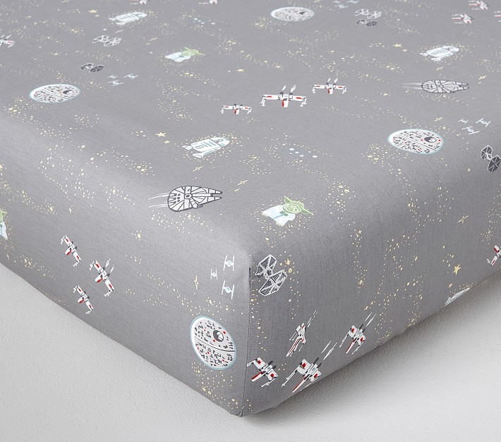 Add epic style to your Padawan’s™ bedding. This Star Wars™ Crib Fitted Sheet features iconic print of the Millennium Falcon™, TIE fighters ™, the Death Star™ ™ and their favorite characters across a starry sky. It’s woven from pure organic cotton percale for a durable, cozy sleep space. This Star Wars™ nursery collection is designed exclusively for Pottery Barn Kids.