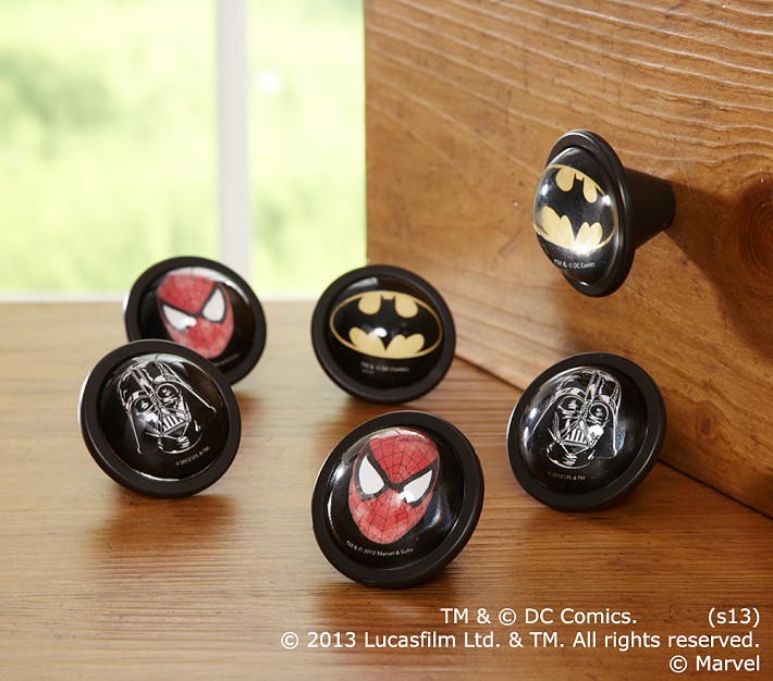 Even Super Heroes have to put their things away. Make it more fun by accenting dressers and nightstands with knobs featuring Spider-man™, Batman's™ Bat Emblem logo and Darth Vader™.