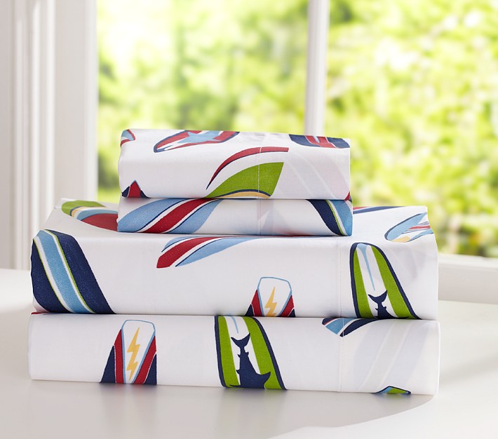 Catch a wave to cool summer style with these seaside-inspired sheets. Short boards in a host of fun hues and beachy designs are printed on soft cotton percale.