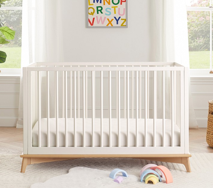 Both clean-lined and classic, our Sydney convertible crib suits a range of decor styles. Expertly crafted of sturdy, white-finished poplar and natural birch legs, its stylish two-toned palette adds contemporary flair to the restrained silhouette. Conversion kits (sold separately) are highly recommended to support your growing toddler’s needs.