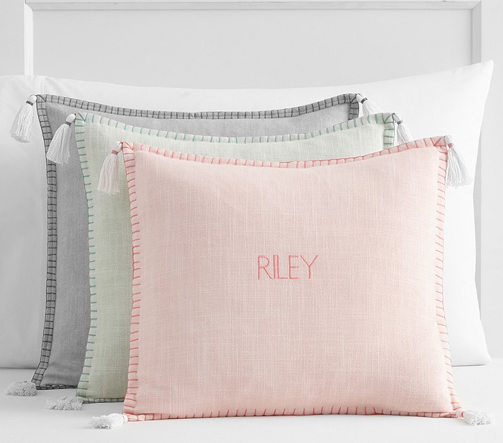 - Pillow features blanket stitching and 4 tassels, one on each corner.