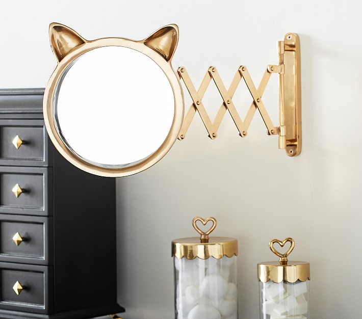 Our accordion-style mirror is truly the cat's meow! Featuring a shining gold finish and dainty cat ears, it easily mounts to the wall to save you space and boost your primping style! Designed exclusively for PBteen by celebrity stylists and fashion designers Emily Current and Meritt Elliott, it captures their classic and rebellious aesthetic.