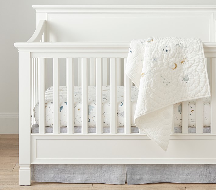 - Four-sided crib skirt fits around the entire crib and is tailored with split corners for easy placement around posts.