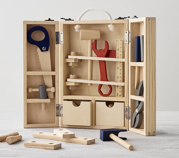 Calling all builders! Designed for little hands that are ready to work, this set gives children the chance to hammer, saw, twist and pull to their heart's content. Each tool is crafted from solid wood and sanded to a smooth finish, and the case is fitted with a rope handle for easy trips to and from the worksite.