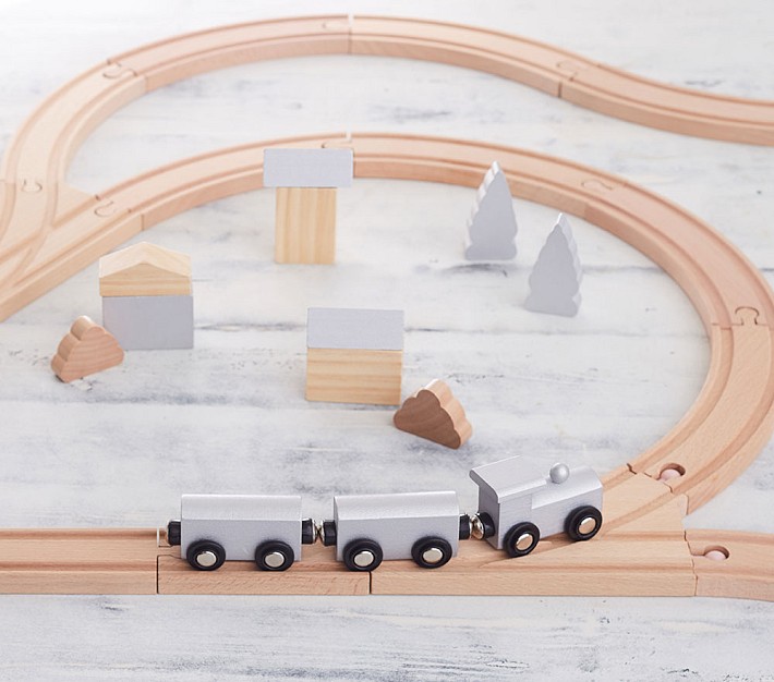 A truly magical gift, this deluxe train set includes everything your little one needs for endless hours of imaginative play. Each piece is constructed from solid wood and finished in a striking silver hue.