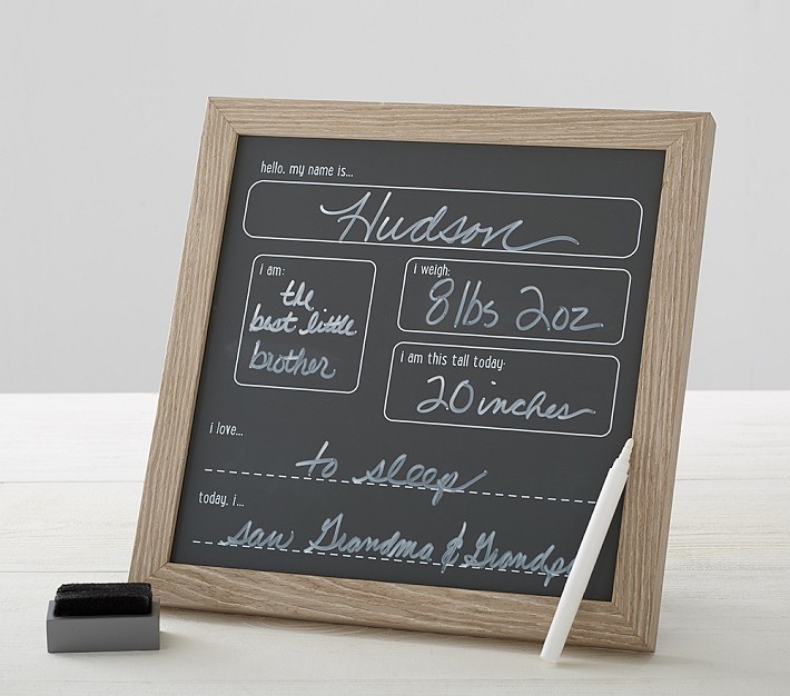 Perfect for photo ops and social media posts, this fun chalkboard gives you an easy way to display your child's stats, from age and height, to favorites and milestones. The included chalkboard pen produces white lettering that wipes away with a simple swipe.