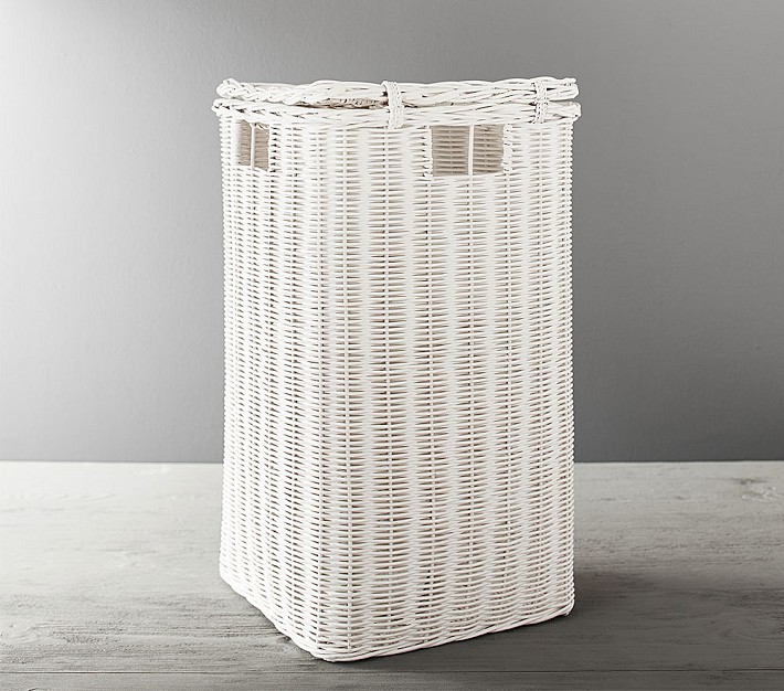 - Hamper and lid are handwoven of wicker and wrapped Lampakanay Rope.