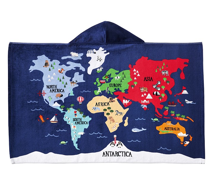 After they swim the seven seas, wrap them up in our cuddly hooded towel. The whimsical world map is printed on pure cotton terry velour with a plush feel, great absorbency and UPF 50+ protection.