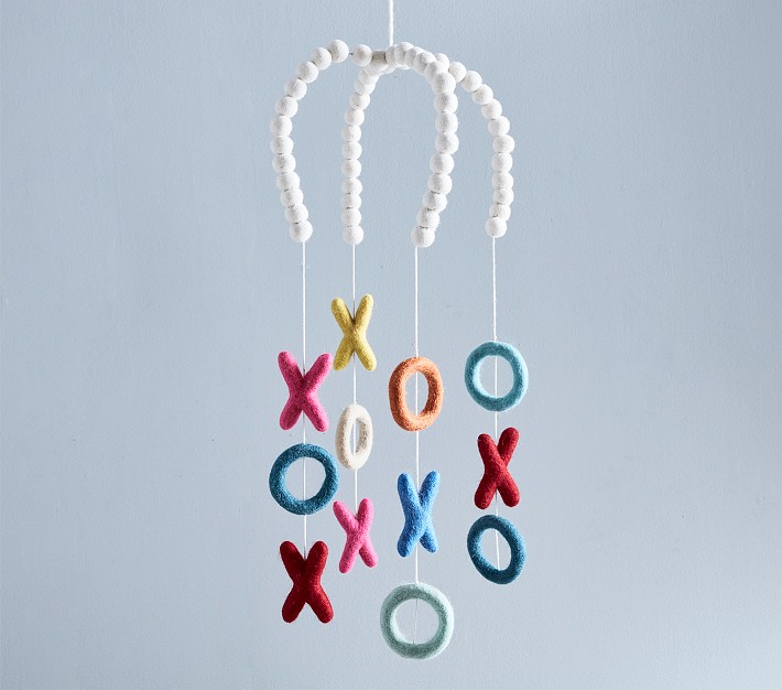 Create a sweet display that reminds them they’re loved with our charming XOXO Felted Ceiling Mobile. The frame is decorated with pom-poms that complement a neutral nursery with style, while colorful x’s and o’s circle overhead to your baby’s delight, making it easier for your little one to settle down and fall asleep.