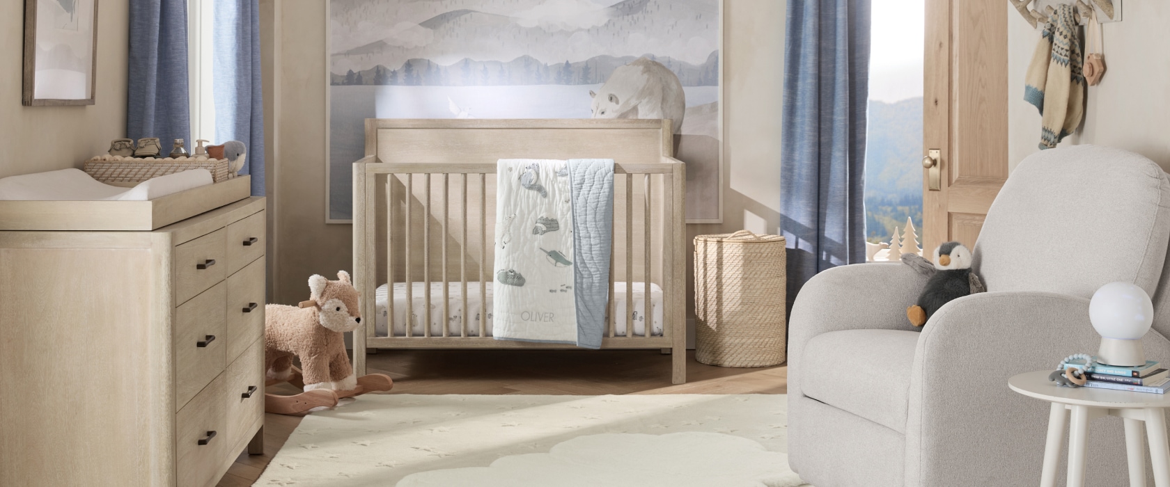 A well-designed nursery will help you to navigate life with a newborn. Start by choosing a great crib and a changing table with plenty of storage space. If you have the space, a nursery glider chair is also incredibly helpful to have for late night feedings and for rocking your newborn to sleep.