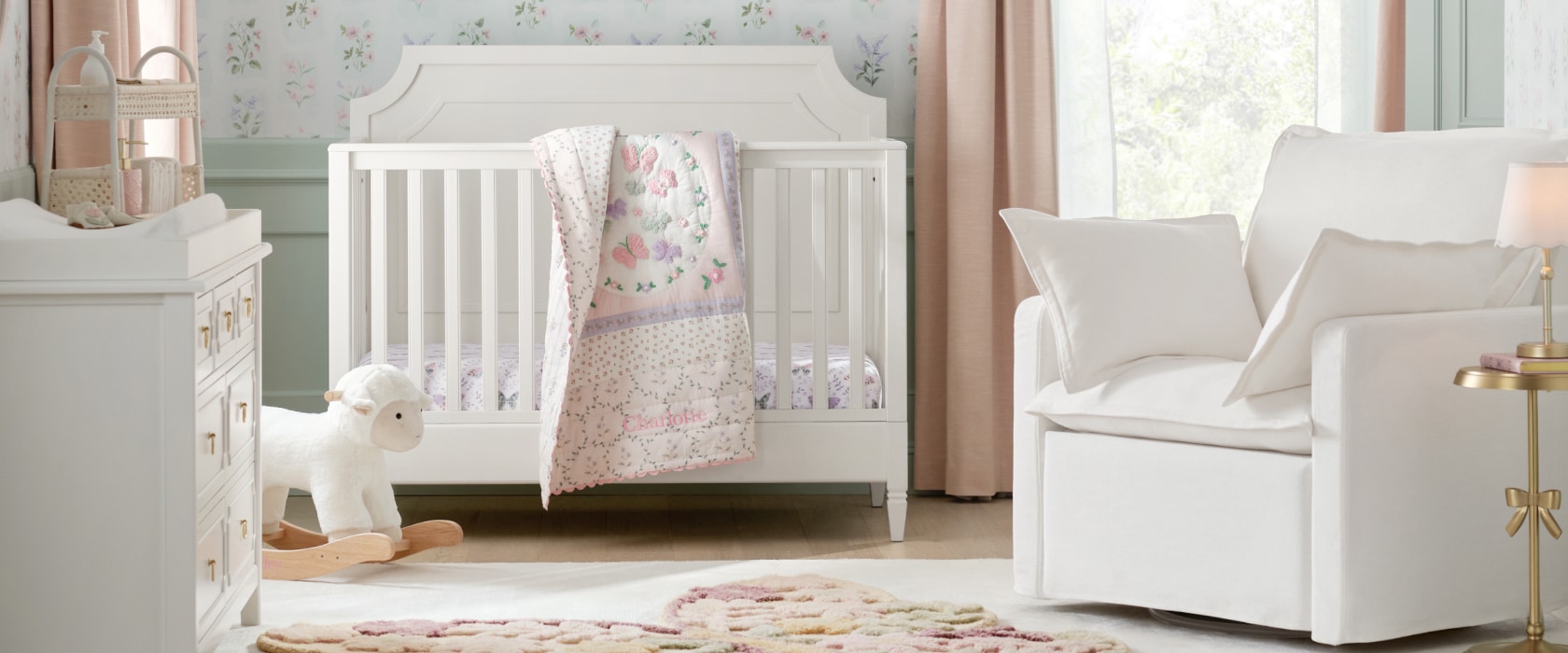 This collection's classic beauty is enhanced by appliqué trim inserts and tapered feet.