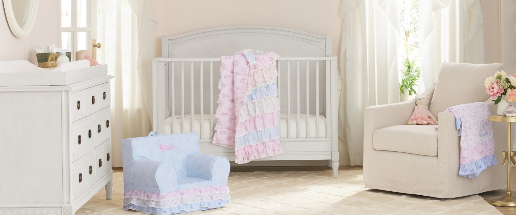 Vintage Gustavian furniture inspired Clara’s classic proportions and refined touches for a dreamy space to welcome your little one.