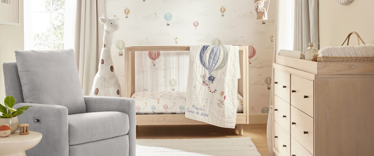 A modern take on a classic nursery, this sturdy collection boasts acrylic slats to complete a clean, chic style aesthetic.