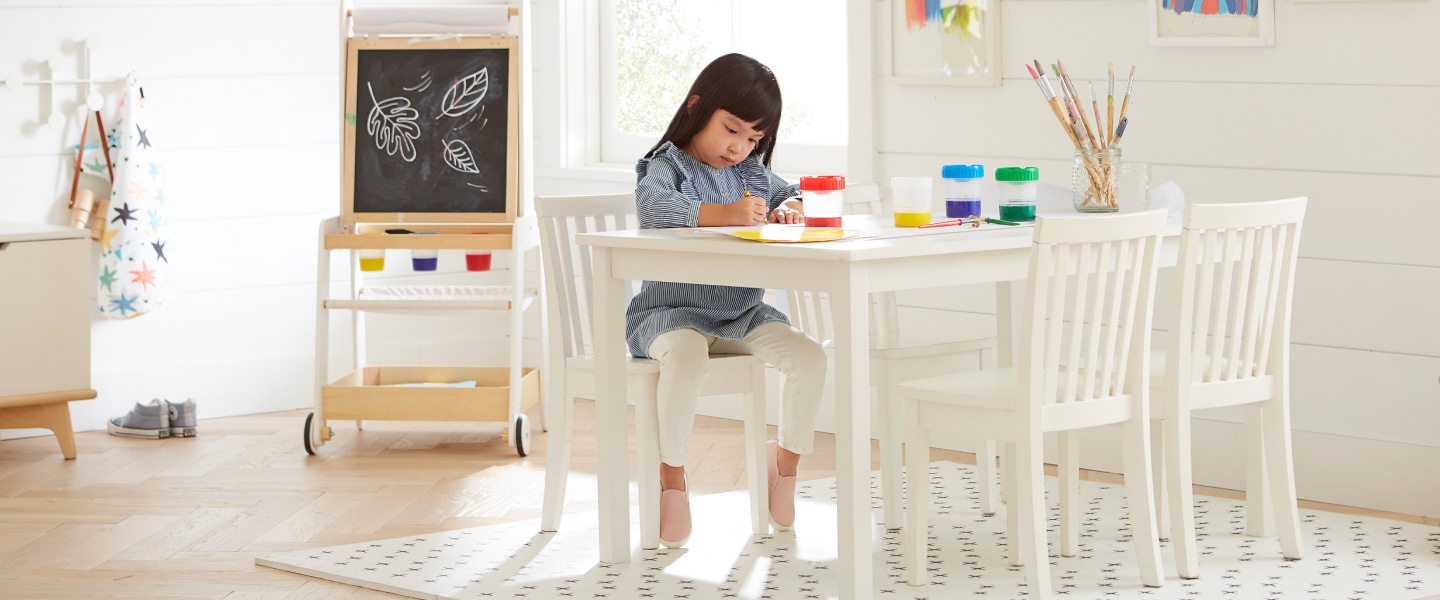 Sweet lines, durable hardwood and smooth, easy-to-clean surfaces make this the ultimate arts-and-crafts destination for every play space.