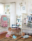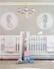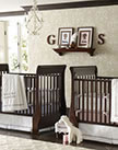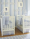A rich brown makes a great starting point for a shared nursery. We used piqué crib bedding with personalized quilts to create cribs that have distinct boy and girl appeal. We added a decorative stencil to the wall that echoes the scrolls of the chandelier. Framed silhouettes of each child hung next to their initials create an elegant wall display.