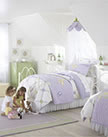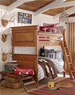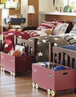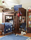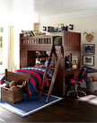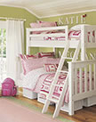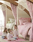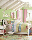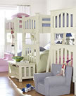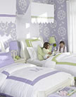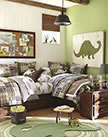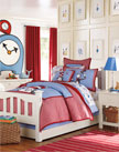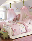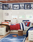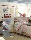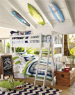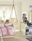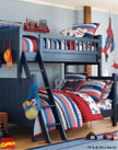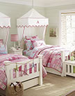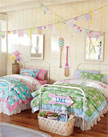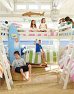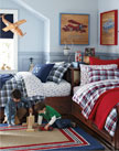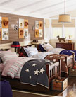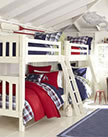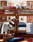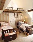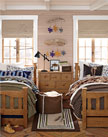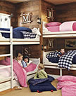 Polka dots, buffalo checks and solids in classic colors make it easy to create unique beds in a space shared by boys and girls. We chose rich navy and pink to complement the room's unpainted wood walls, and used branches to frame each child's initial over their bed. Wall-mounted sconces are space-efficient and convenient for bedtime reading.