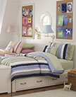 For this shared bedroom, we kept the bedding simple and classic and brought a playful, lively pattern to the walls with a custom stencil. Coordinating personalized bedding in purple and green lets each girl feel a special sense of ownership in her bed, and scalloped canopies give them a magical charm. Polka-dot lampshades and other accessories reflect the color theme and bring added fun and whimsy.
