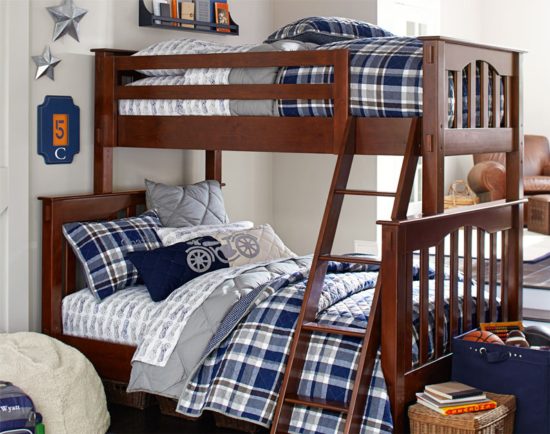 A twin-over-full bunk bed accommodates boys of two different ages in this shared room. Gray, white and navy bedding beautifully complement the espresso finish of the furniture and wood beams. A rustic wall plaque fits the theme and celebrates the joys of brotherhood. Woven baskets at the foot of the bed offer storage and add to the room's natural appeal.