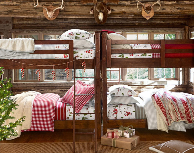 We designed this woodsy shared space with a few cohesive elements plus mix-and-match layers to make the details stand out. Holiday-themed sheets serve as the foundation for each bed, while gingham and stripes in gray or red add visual interest to each individual space. Lastly, we styled each bed with its own quilt, creating a look that celebrates comfy, cozy warmth.