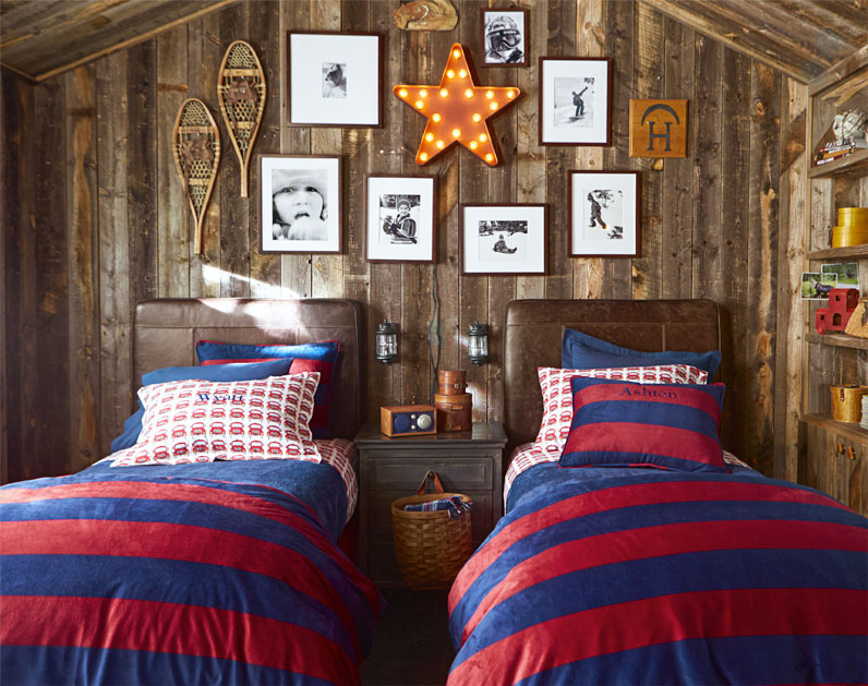 Crisp rugby stripes and a gallery of action-packed photos are what give this room its bold, handsome look. Anchoring the wall display is our Light Up Star – the perfect way to add both light and style to any kid's room. The duvet's pattern takes center stage, while a graphic fire-truck print on the sheets and shams playfully breaks up the bed.