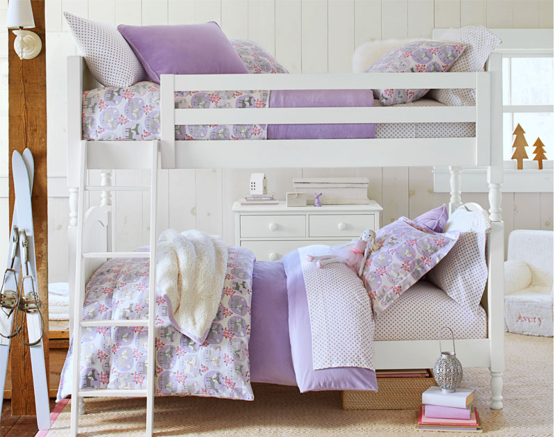 This little girls' room makes the most of a shared room with a bunk bed that doesn't sacrifice style for space. A soft purple serves as the bedding's foundational color, while simple polka dots and patterned duvet covers add visual interest, texture and loft.