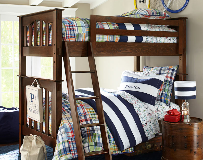 A classic bunk bed makes the most of a small space in this shared room for two boys. We chose identical bedding—a mix of bold rugby stripes, classic madras and a playful bicycle pattern—for each bed, using embroidered names to make each sleep space personal. A rounded bedside table helps break up all the sharp angles in the furniture and textiles, while a rugby-striped table lamp ties the look together.