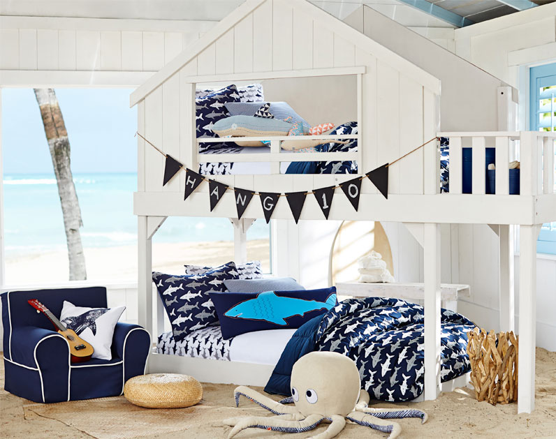 A treehouse bunk turns this shared space into a magical retreat. Bright blue trim pops against the whitewashed walls to create a fresh design. We chose playful shark sheeting and pillows to carry the beachy theme, along with decorative bunting featuring a favorite phrase for surfers. A woven rug and pouf add laid-back style to the floor.